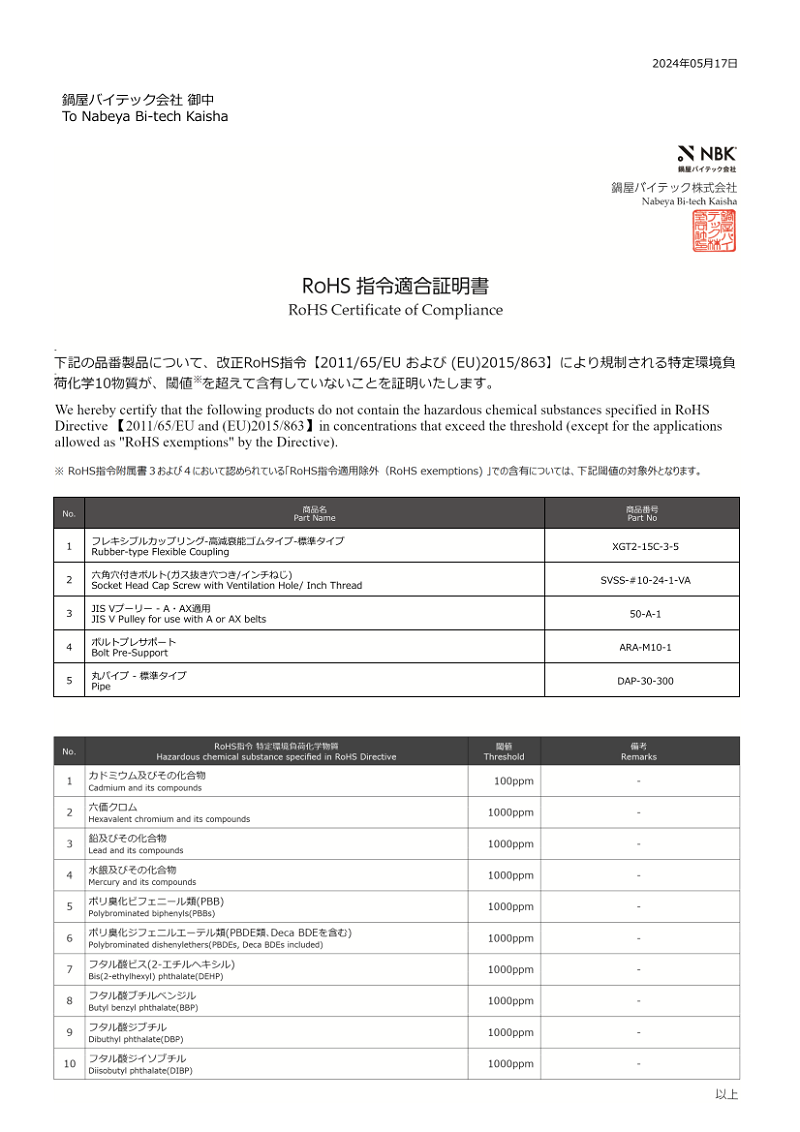 RoHS2適合証明書の宛先を入力してください。証明書の宛先 は200 文字以下で入力してください。 - 証明書の宛先(英語)