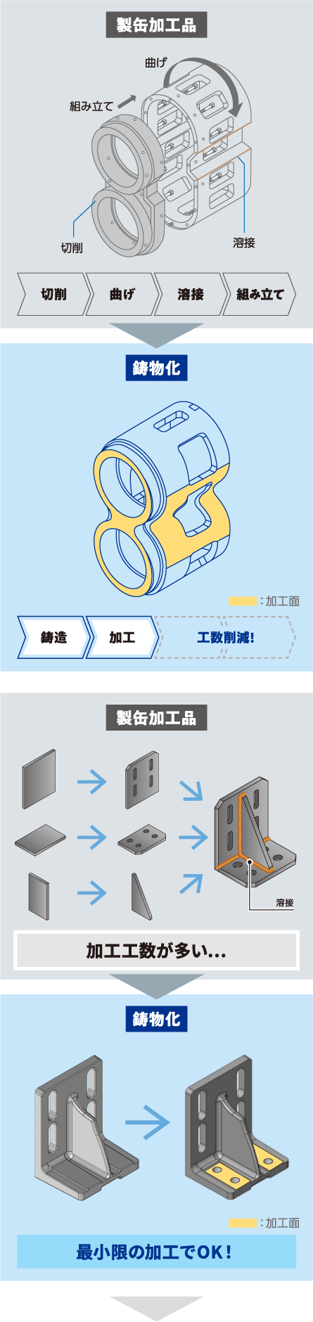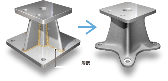 鋳物化とは、製缶加工で製作する部品を鋳物で製作することです。