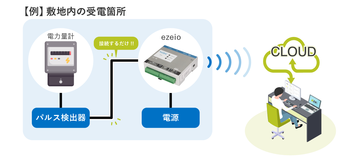 ezeioは無線通信のため、データの送受信のための配線が不要です。 本体に電気量計と電源を接続するだけで簡単に導入できるため、 電気工事費用を抑えられます。